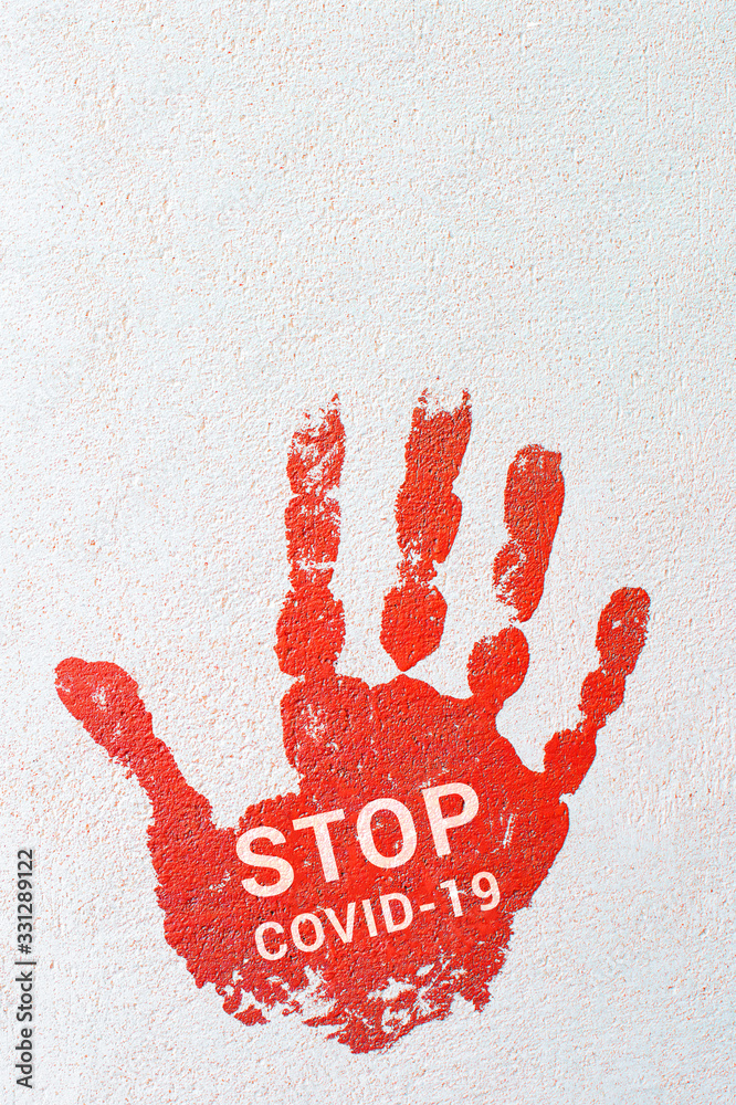 A handprint with the inscription STOP COVID-19 on a light concrete wall. Stop COVID-19 concept.