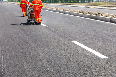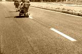 Road workers use hot-melt scribing machines to painting dividing line on asphalt road surface in the city.