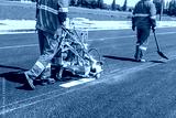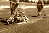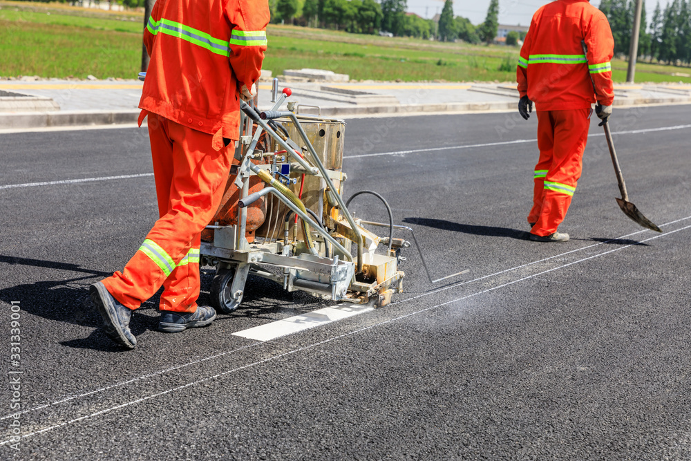 Road workers use hot-melt scribing machines to painting dividing line on asphalt road surface in the city.