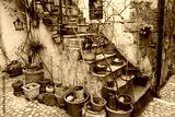 Cozy Italian courtyard with stairs and plants. Medieval home facade in Italy. Beautiful steps with plants and flowers.