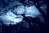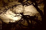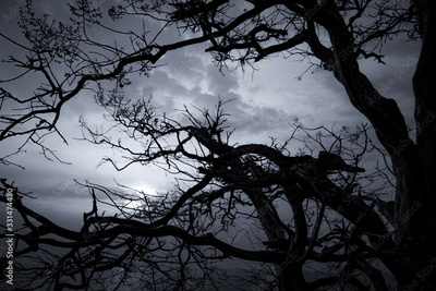 Silhouette dead tree on dark dramatic sky and white clouds background for death and peace. Halloween day background. Despair and hopeless concept. Sad of nature. Death and sad emotion background.