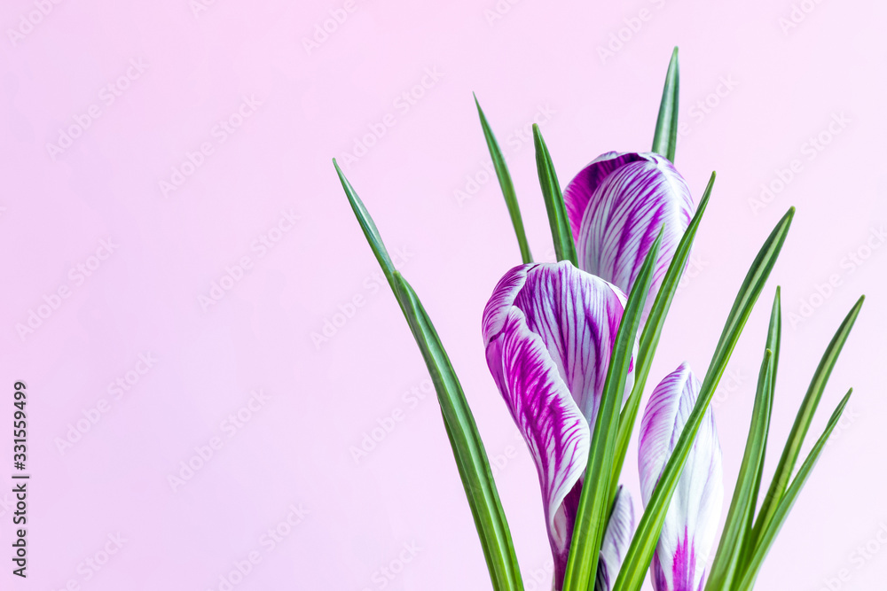 Large crocus Crocus sativus C. vernus flowers with purple streaks on a pink background for postcards, greetings for Birthday, Mother's Day, Valentine's Day