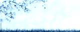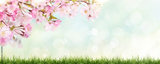 Pink cherry tree blossom flowers blooming above a green grass meadow on a spring Easter sunny day banner background.