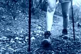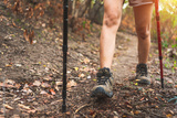 Children hiking in mountains or forest with sport hiking shoes. Girls or boys are walking trough forest path wearing mountain boots and walking sticks. Frog perspective with focus on the shoes.