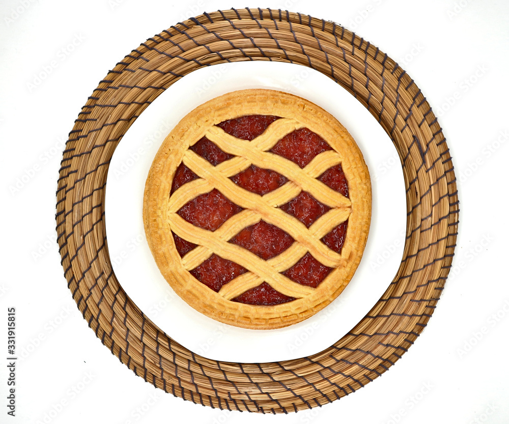 Top view of a cherry jam tart pie on plate and round tablemat. White background