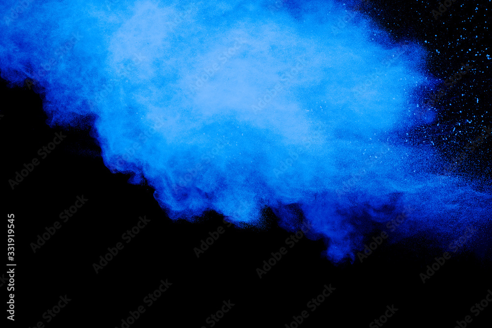 Blue dust explosion on black background. Freeze motion of color powder splash.