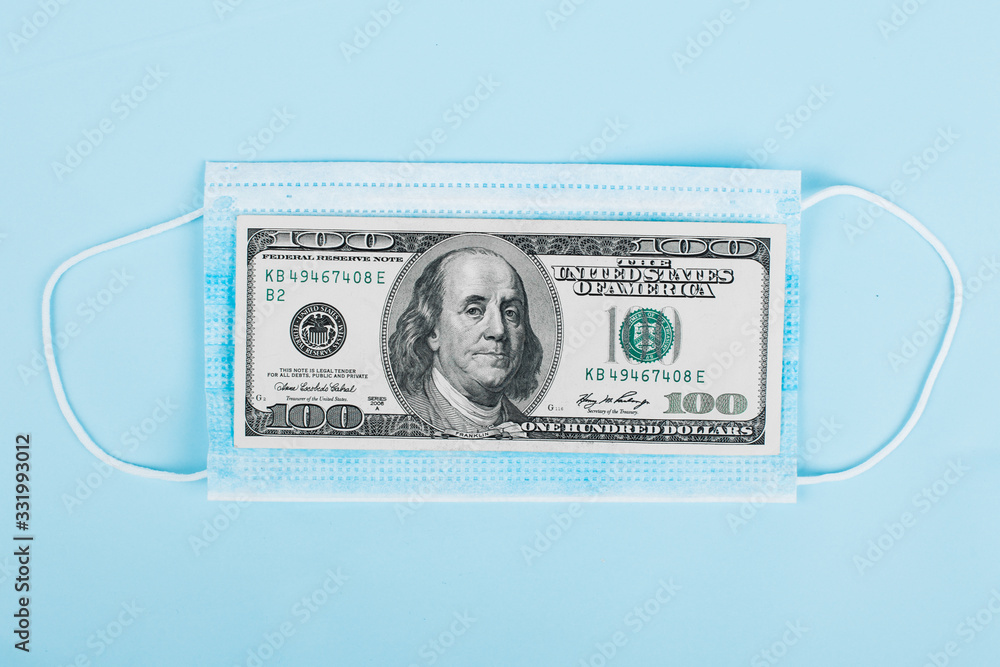 Sale of medical masks. Medical mask with money on blue background. Coronavirus concept. 2019 nCoV.