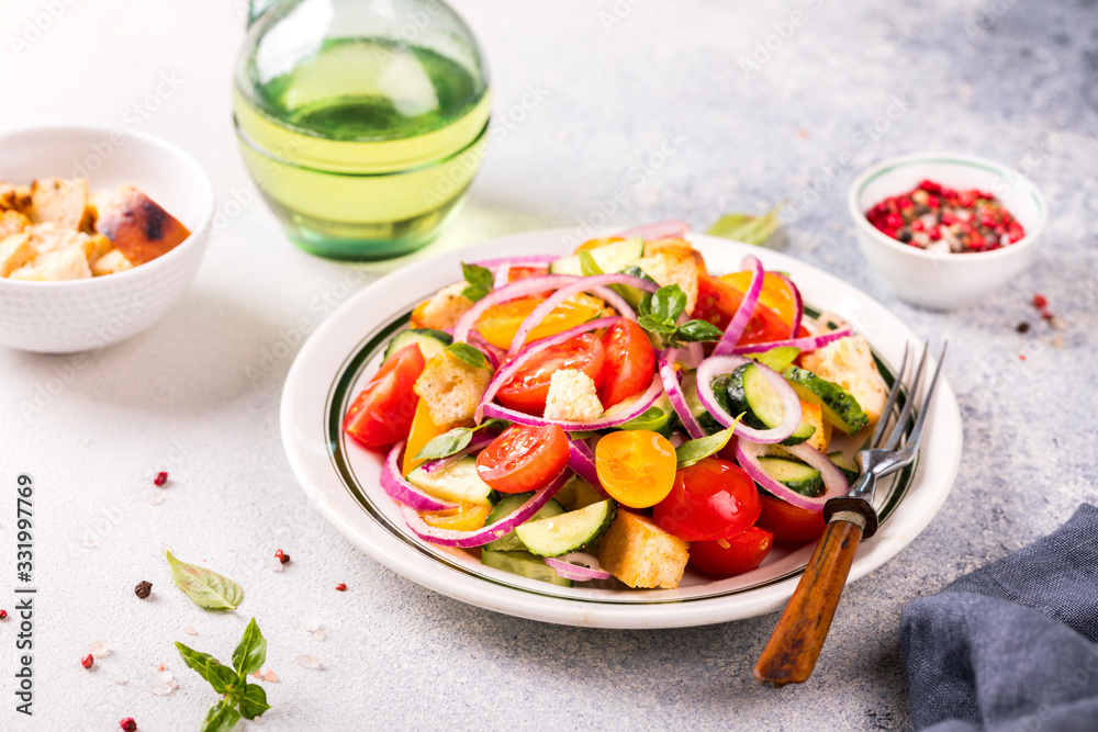 Vegetable salad. Panzanella traditional food of Italy with tomatoes and bread.