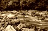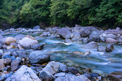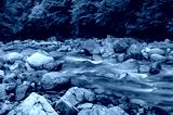 Icy cold mountain river flowing through rocks and boulders in the forest