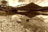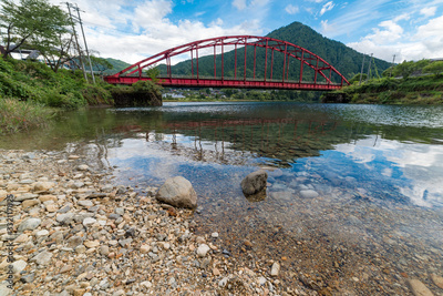 Red bridge and river in the mountain valley. Japanese countryside landscape