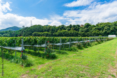 Vineyard summer landscape with rows of grape plants and grass