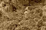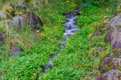 Forest spring, stream with green grass and rocks