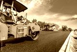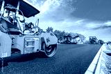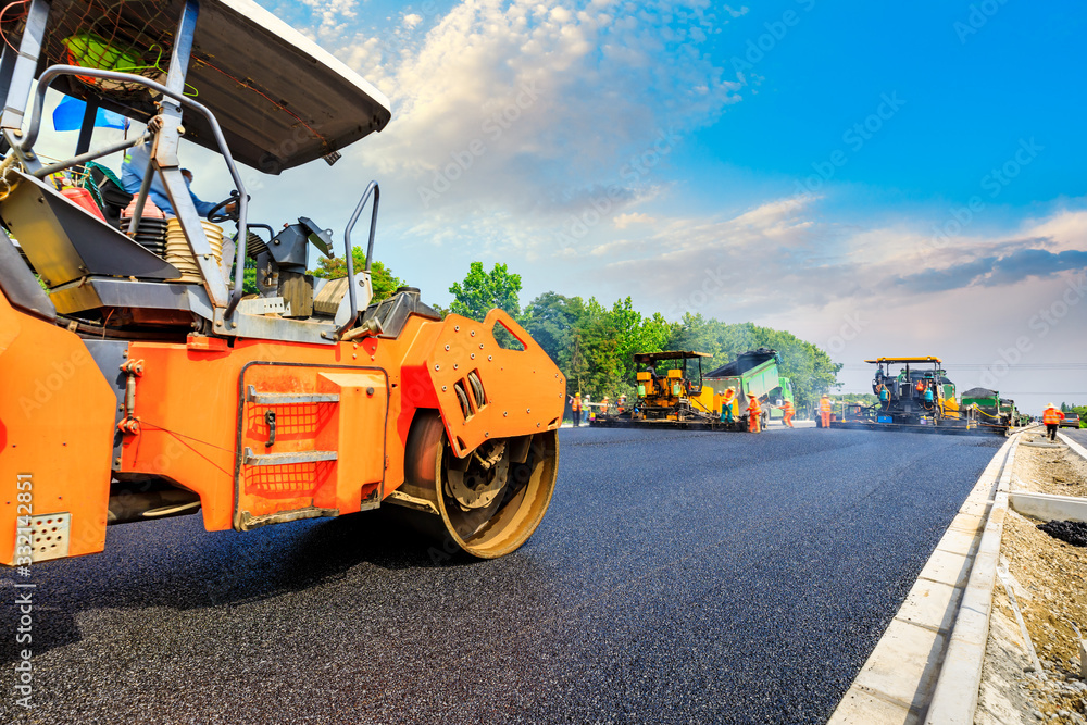 Construction site is laying new asphalt road pavement,road construction workers and road construction machinery scene.highway construction site landscape.