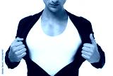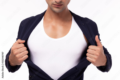 Businessman open suit, act like a super hero with isolated on white background. Handsome young businessman gets confident and determined. Attractive guy ready for working hard. He is brave man