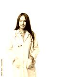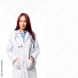 Young asian female doctor get confident with smile face. Asia woman doctor wear coat, hang stethoscope on neck. She put hands in gown pockets. Health care, medical care, insurance concept. copy space
