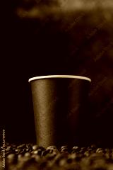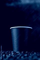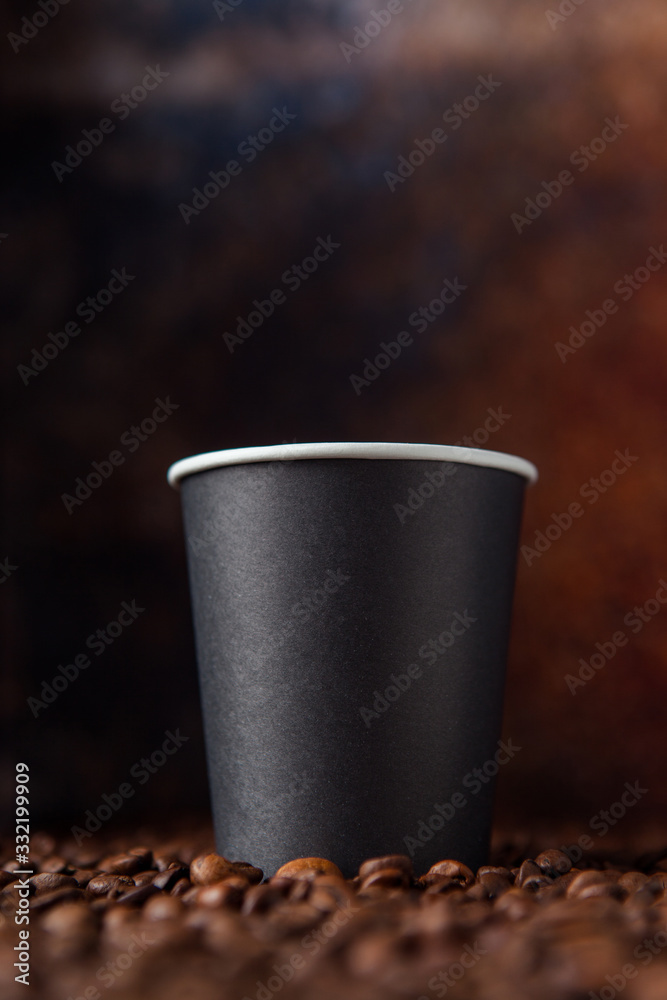 Take away black coffee cup with roasted coffee beans. Space for application logo