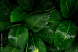 Foliage in dark green pattern with rain water drop. Top view shot of tropical leaf. Abstract nature background of green environment concept.