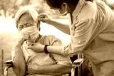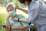Sick elderly woman with coughing and fever,risk symptoms of flu,pandemic of Covid-19, asian daughter wearing protective mask to senior mother,prevent outbreak or spread of Coronavirus to other people