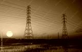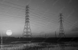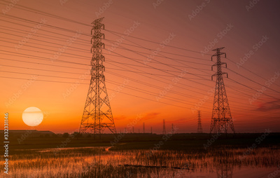 High voltage electric pylon and electrical wire with sunset sky. Electricity poles. Power and energy concept. High voltage grid tower with wire cable. Beautiful big sun at sunset with red-orange sky.