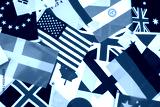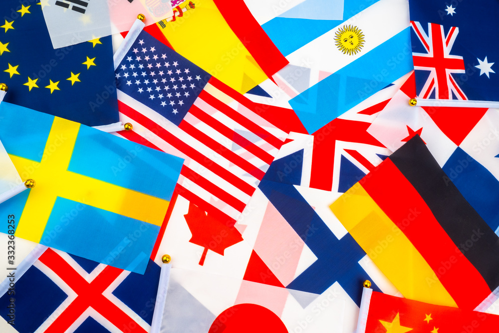 Many national flags are on the table. Bright background of national flags. Official state symbols. Banners from different countries of the world are photographed on the table.