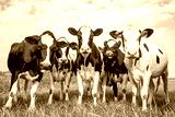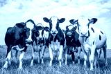 Group of cows together gathering in a field, happy and joyful and a blue sky.
