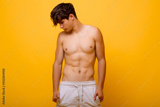 Portrait of a sexy young man with muscular body posing at studio. Orange background. Men's health. Fashion portrait of strong guy with trendy hairstyle. Naked torso, six pack abs.