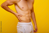 Half naked sexy body of muscular athletic man, isolated on yellow background. Cropped image of a handsome muscular men body standing isolated on a yellow background.