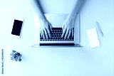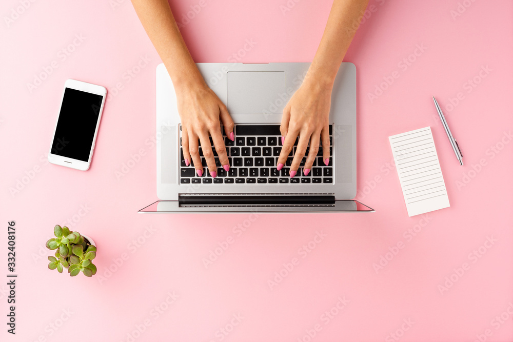 Overhead shot of female hands using laptop on pink office desktop. Business background. Flat lay