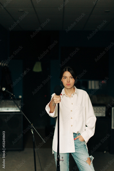 Young woman with mic in music studio