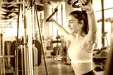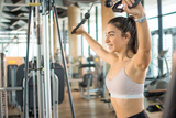 Sporty young woman doing exercise for back, using machine in fitness gym