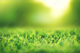 Spring and nature background concept, Closeup green grass field with blurred park and sunlight.