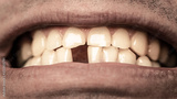 Bad dental health, no teeth, no fluoride, tooth erosion. No teeth. Smile men with a lost front tooth, toothache. Yellow teeth. Man without one front tooth