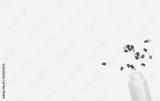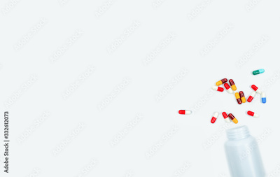 Colorful antibiotic capsules and plastic drug bottle isolated on white background. Antibiotic drug resistance concept. Pharmaceutics. Pharmaceutical industry. Pharmacy drugstore. Pennicillin pills.