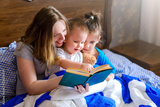 Happy family mother, child daughter, son kid read a book in bed in the morning, before going to bed. Family education. Classes at home during quarantine. Early childhood development. World book day.