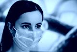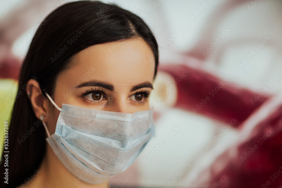 Coronavirus concept on red background. Woman wearing facial mask for protection from virus pandemic. Coronavirus concept. Respiratory protection concept with copy space.