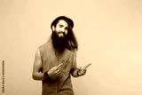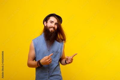 Horizontal studio shot of emotional energetic charismatic man showing direction, making gesture, wearing tee shirt and grey hat, being in good mood. Copy space for advertisement. Long hair and beard.