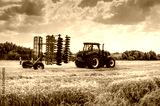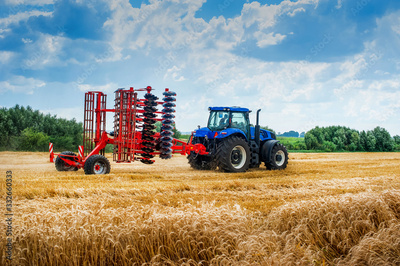 blue tractor pulls red harrow folded for transportation, arable land preparation for sowing campaign