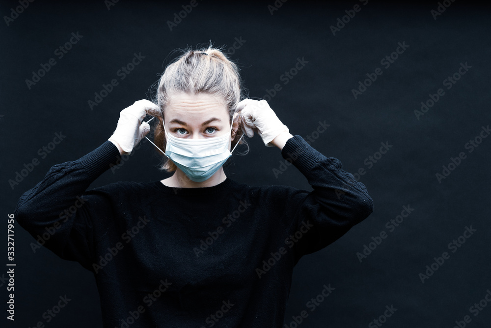 une jeune femme blonde se place un masque de protection sur le visage