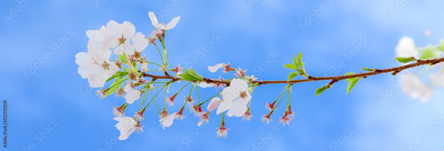 Panoramic upward view of cherry tree branch with blossom flowers and young leaves in cloud blue sky