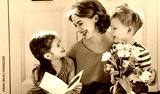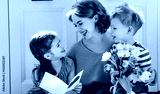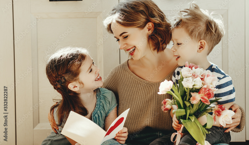 Cheerful little girl with card and youngest brother with bouquet of tulip flowers smiling and congratulating happy mom on mother day at home.
