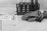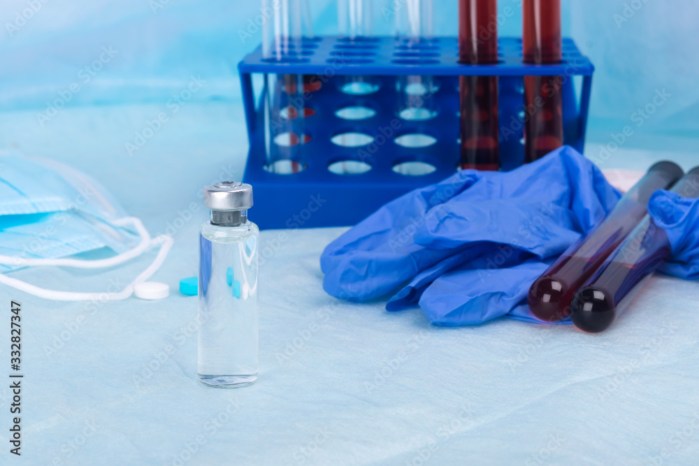close-up, blood for express analysis of coronavirus, laboratory tube stand, gloves for protection and masks. Ampoule with medicine.
