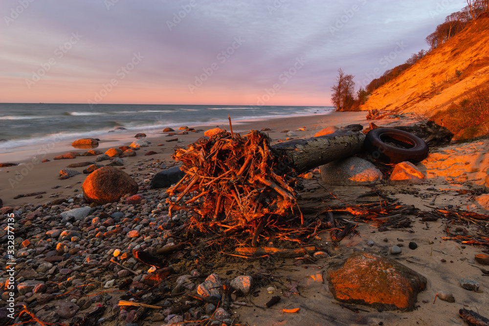 Cliffs and sandy beach In Wolin National Park in the light of the setting sun
