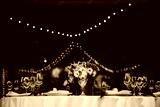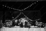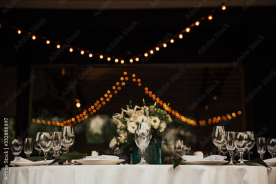 Elegant table set with glasses, lights and white flowers. Wedding table setting. Luxury table settings for fine dining with and glassware, beautiful dark background with lights. For events, weddings.