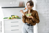 Portrait of a young and cheerful woman eating healthy salad on the kitchen at home. Healthy eating, wellbeing and lifestyle concept