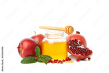 Apples, pomegranate and honey isolated on white background. Natural treatment