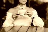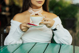 Close up image of woman holding a cup of hot latte in the cafe. Photo of refined girl enjoying beverage in white cup.