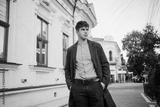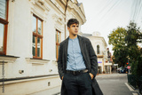 Serious european young man in a trendy gray coat, blue shirt with a stylish hairstyle stands in the city near a vintage building. Attractive guy is a fashion model. Fashionable menswear.