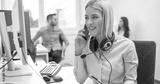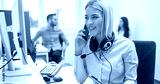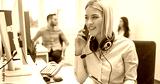Beautiful young business woman talking on mobile phone at office