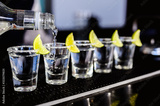 Gin or vodka with lime. Many glass with a cocktail alcohol with lemons on the black blue surface. Vodka, cocktail, alcohol, beverage, .restaurant, relax concept.