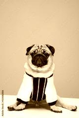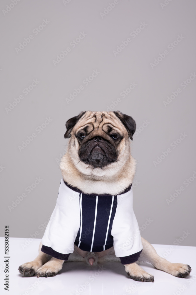 Cute dog pug breed standing and making funny or serious face feeling happiness and cheerful,ฺBeautiful Purebred dog and healthy dog,Isolated on white background,Dog friendly Concept
